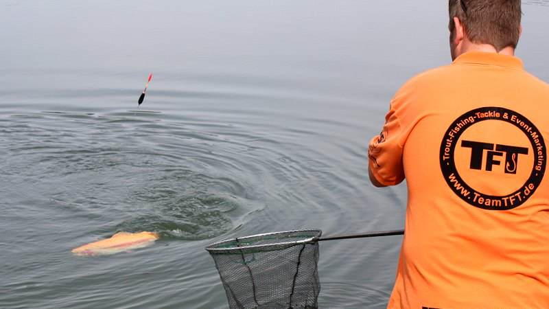 Nach dem Essen ging es gleich wieder an die Arbeit. Es stand der Abdreh des Fazits auf dem Programm. Außerdem wurden viele Details zu den Montagen und auch zur Angelstrategie erklärt. Das alles verlangte den Akteuren wieder viel Geduld ab. Denn im Hintergrund waren die Fische immer noch in Fresslaune. Daher konnte es Lars auch nicht lassen, eine Balerina doch noch nebenher auszulegen. Der vorgebleite Schwimmer war schon recht dicht an das Ufer getrieben und ich konnte noch gerade aus den Augenwinkeln erhaschen, wie sich eine prächtige Goldforelle flott und unbemerkt den Köder schnappen wollte. Da ich die Kamera bereit hatte, konnte der Biss genau festgehalten werden. Perfekter kann ein Angel-Tag für einen Angelfotografen wahrlich nicht enden!