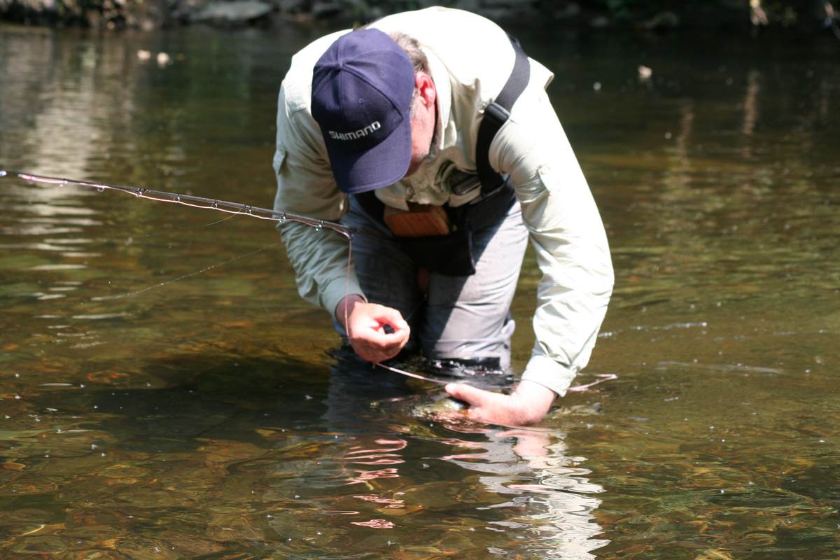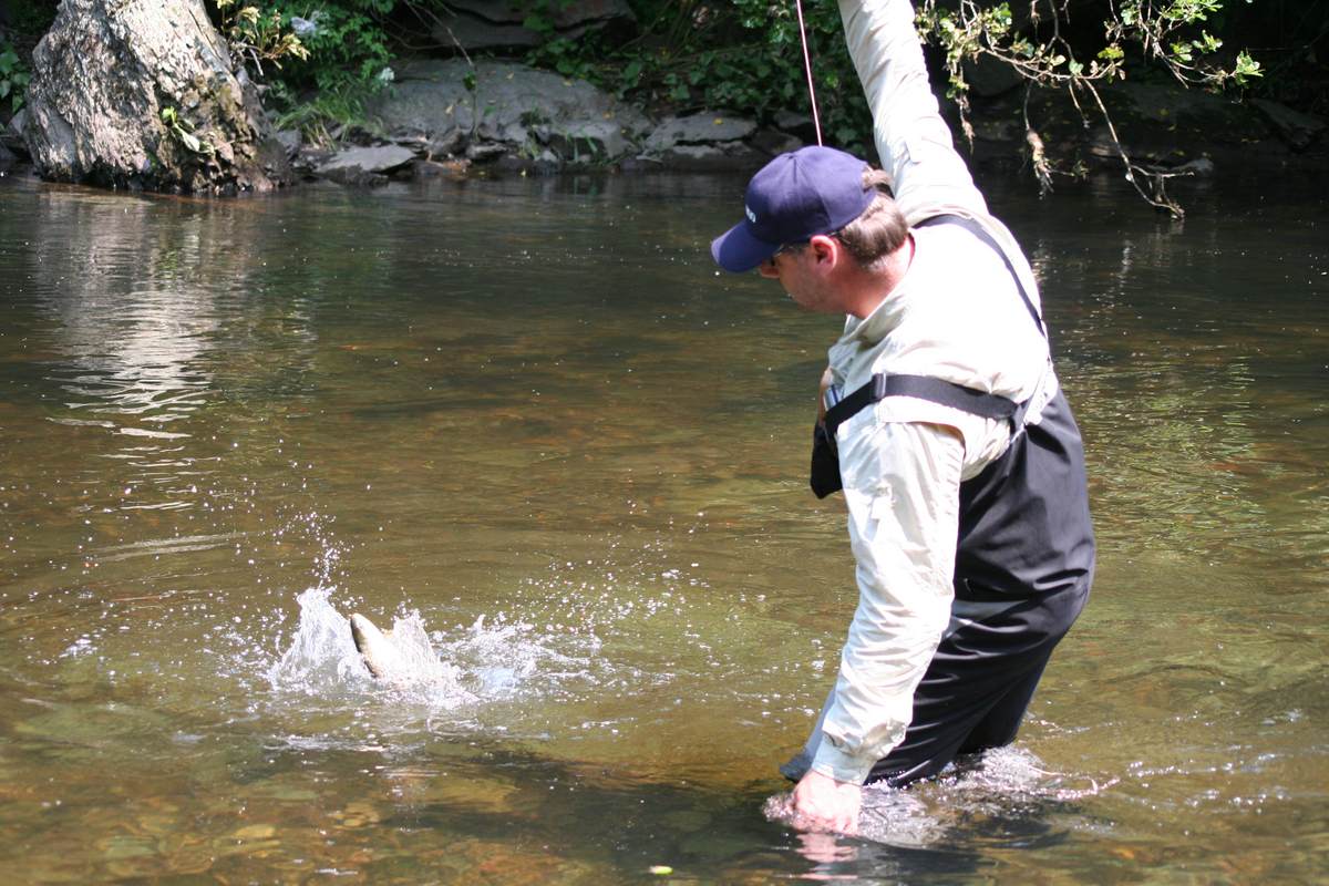 Shimanos Petra Krichel hatte alles vortrefflich organisiert, so dass jeder kugelrund zur nächsten Angel-Etappe aufbrechen konnte. Die Sonne stand nun für die Forellen genau richtig, denn jetzt ging es Schlag auf Schlag und die Forellen wurden von Fang zu Fang schöner. Für mich steht fest, die Wupper ist wieder ein absoluter Kristallstein im bergischen Land. Ich habe viel Forellen- und Barbenbrut beobachtet. Außerdem gibt es Äschen, Meerforellen und seit 1995 werden auch regelmäßig Lachse (Lachsprogramm 2000) ausgesetzt. Das Flüsschen liegt in einer traumhaften Landschaft und ist vom Kölner Raum sowie vom Ruhrgebiet erstklassig zu erreichen. Wer einmal selbst einen schönen Fliegenfischertag an der Wupper verleben möchte, bekommt Tageskarten beim bewirtschaftenden Verein: Bergischer Fliegenfischerclub, Landsberger Str. 41, 45219 Essen, Tel. 0175-7810749 (Dirk Pollman, 2. Vors.).