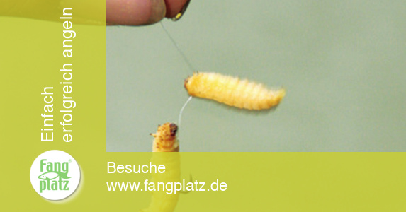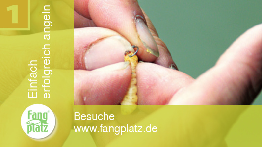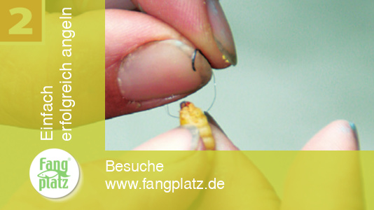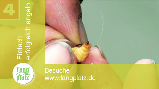 Bienenmade hinter dem Kopf auf den Haken ziehen und dann auf die Vorfachschnur schieben.