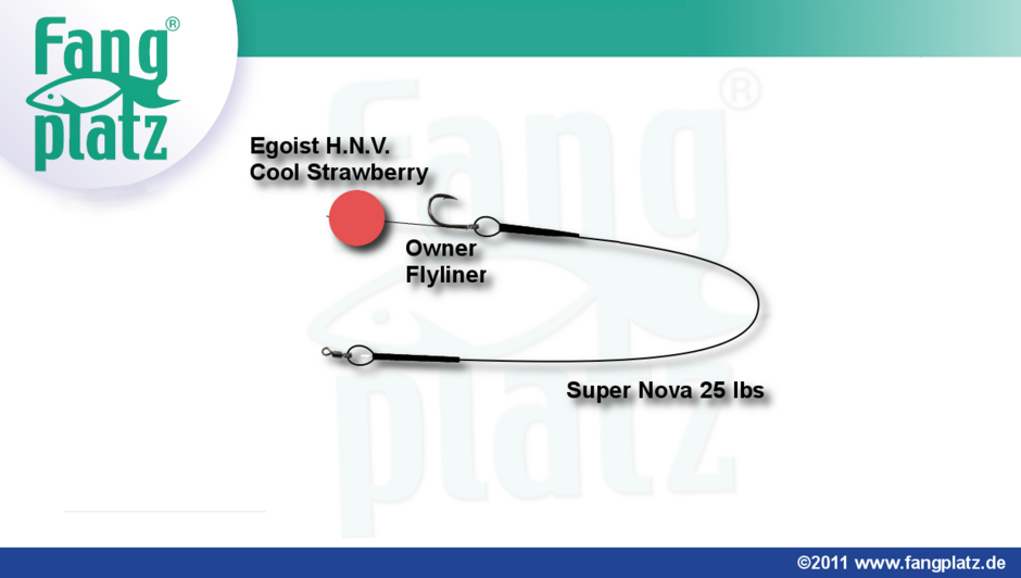 Auf einem Super Nova mit 25 lbs (von Kryston) ziehe ich 2 kleine Schläuche von ca. 1cm Länge. An der einen Vorfach-Seite befestige ich einen Tönnchenwirbel mit einem Ösenknoten (die Schlaufe soll 2cm lang sein). Den 6er Owner-Haken mit angebundenem und 2 Silikonschläuchen am Schenkel fixierten Haar knüpfe ich ebenfalls mit einem Ösenknoten an die Hakenöse (2cm lange Schlaufe). Dann ziehe ich die Plastikschläuche über die Knoten. Am Tönnchenwirbel ziehe ich den Schlauch soweit über den Knoten, dass die Öse auf ca. 0,3cm Länge geschrumpft wird. Beim Ösenhaken soll die Schlaufe 1,5cm lang bleiben. Das ist extrem wichtig, denn nur so setzt der Schreck-Effekt („frightener“) beim Karpfen ein, wenn er den Boilie nimmt. Sobald er nämlich vorsichtig den Boilie aufsaugt stößt er mit dem Maul vor den über die Schlaufe gezogenen Plastikschlauch. Er erschreckt sich, möchte den Köder ausspucken und hakt sich so den Haken selbst in sein Maul. Diese Montage funktioniert aber nur im Frühjahr so gut, wenn die Fische sehr sehr vorsichtig mit den Ködern umgehen.
