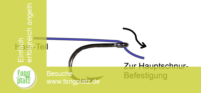 1) Passend gekürztes Vorfach mit dem Ende, was später an der Hauptschnur befestigt wird von oben durch das Hakenör führen. Jetzt die gewünschte Länge des Haares einstellen.