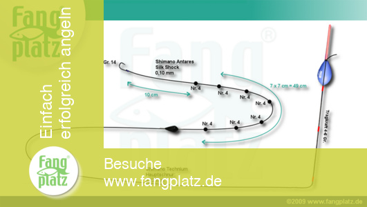 Flott positionierte er seine Kiepe am Wasser und schnappte sich seine Kopfrute aus dem Futteral. Jan wollte mit der 13m langen Stange konzentriert die Rotaugen beschäftigen und so eine erfolgreiche Angelsession gestalten. Zum Einsatz kamen eiförmige Rive-Posen mit einer Tragkraft von 5 Gramm. Hier war die Bekanntschaft zu dem mehrfachen Weltmeister Alan Scotthorne unverkennbar. Die Montage und das Tackle waren doch recht ähnlich. Auch das Bebleiungsschema war mit einer größeren Bleiolivette und einer sich nach unten anschließenden Bleikette mit 8er Bleien fast mit der Anordnung von Alan vergleichbar (s. Abbildung). Allerdings fischte Jan etwas schwerer als Alan. So wie es die heimischen Angler hier ebenfalls gerne und erfolgreich taten.