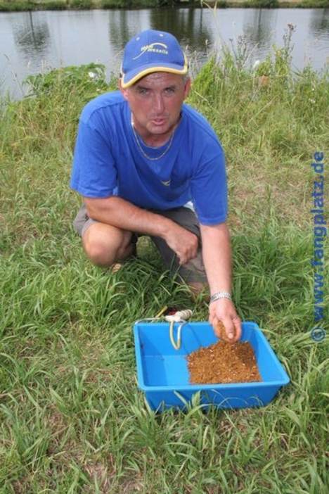 Beim Futter ist es wichtig, dass ihr es mit der Schleuder in einem Ballen an eure Futterstelle befördern könnt. Daher muss es natürlich eine bestimmte Konsistenz haben. Hier können von Angelstrategie zu Angelstrategie Variationsmöglichkeiten vorliegen. Manchmal ist es z.B. sehr sinnvoll, dass das Futter fast wie ein Stein in das Wasser fällt, dort dann absinkt und sich erst am Grund langsam auflöst, wobei kleine Partikel aufsteigen. In anderen Situationen muss dass Futter gerade so fest zusammen geknetet werden, dass es sofort beim Aufprall zerspringt und in schönen Wolken zum Boden rieselt. Viel kann man hier mit Feuchtigkeitzugaben, Knetstärke beim Formen der Futterbällen und Lebendköderanteil basteln. Das ist aber ein anderes Feld für einen neuen fangplatz-Artikel.