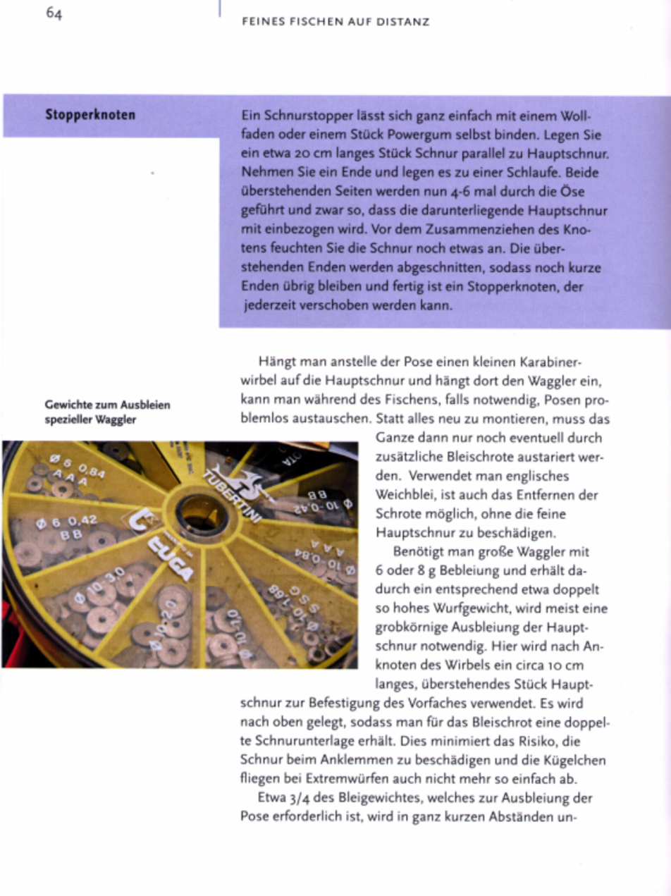 Danach geht es zum feinen Fischen auf der Distanz mit der Matchrute, um dann mit dem Futterkorb und Feederrute am Fließwasser fein auf Brasse, Barbe und Co. zu angeln. Natürlich wird in jedem Abschnitt das jeweilig benötigte Spezialgerät (Feederkörbe, Matchposen, Beschwerungsplättchen usw.) besprochen, so dass der Einsteiger absolut nie im Text im Dunklen tappt.